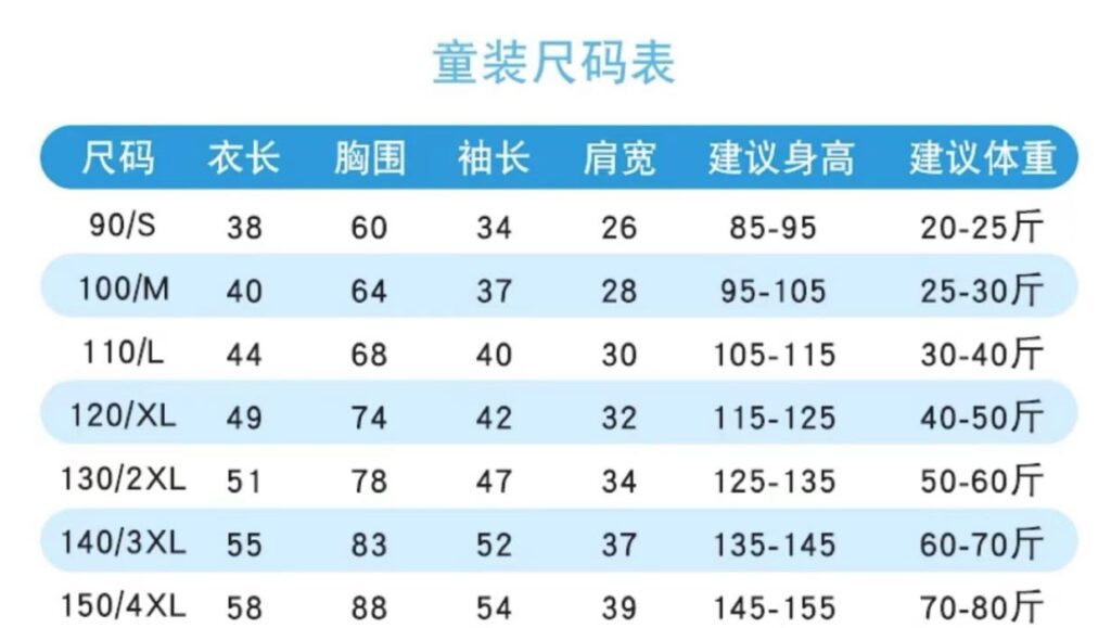 90/S 85cm-95cm, 100/M 95cm-105cm, 110/L 105cm-115cm, 120/XL 115cm-125cm, 130/2XL 120cm-135cm, 140/3XL 135cm-145cm, 150/4XL 145cm-155cm